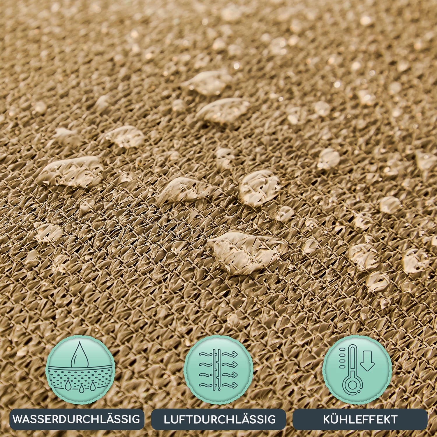 Dank der rostfreien Ringe aus Edelstahl ist die Befestigung sehr unkompliziert. Ziehe einfach die Seile durch die Befestigungsringe, welche du in der Umgebung beliebig anbindest. Für eine dauerhafte Anbringung empfehlen wir dir, anstelle der Seile, Spann- oder Karabinerhaken zu verwenden. Dank des reißfesten und strapazierfähigen Polyester-Materials kannst du das Sonnensegel sehr straff und glatt aufspannen. Zudem ist das Material sehr luftdurchlässig, was dafür sorgt, dass sich unter dem Dach keine Hitze staut. Das Segel hält den Regen ab und ist zudem sehr belastbar, durch festes Material, hochwertige Verarbeitung und doppelte Nähte.