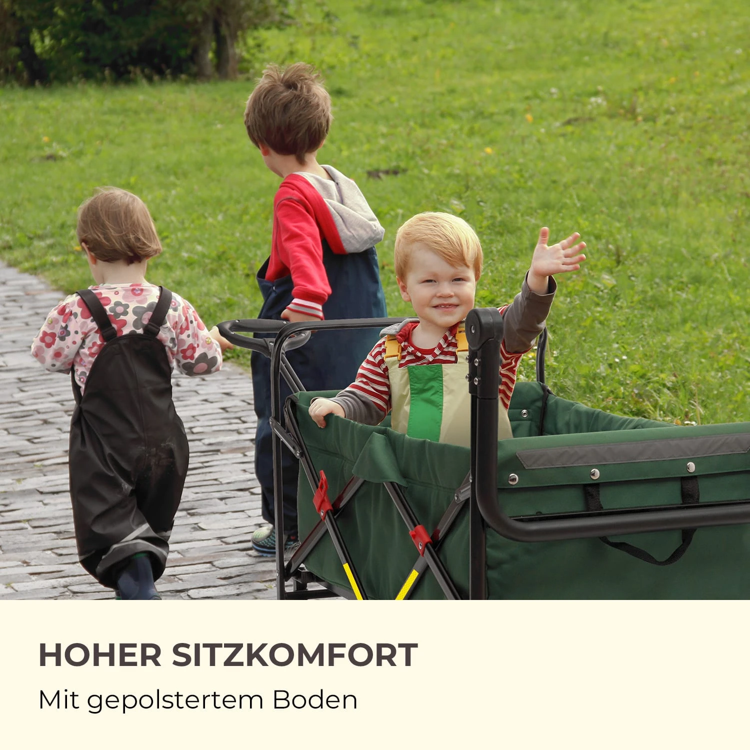 Mithilfe der ausziehbaren Teleskopstange vorne und der klappbaren Schubstange hinten lässt sich der Bollerwagen wunderbar einfach ziehen oder schieben. Die Räder sind frei beweglich und mit Kugellagern ausgestattet, was geschmeidiges und leichtes Fahren garantiert. Für extra Sicherheit, was vor allem beim Transport von Kindern wichtig ist, sorgen die beiden Sicherheitsgurte im Innern und die Reflektoren außen am Wagen. Dank des gepolsterten Bodens ist beim Transport jederzeit ein hoher Sitzkomfort gegeben, der allen Kindern gefallen wird.