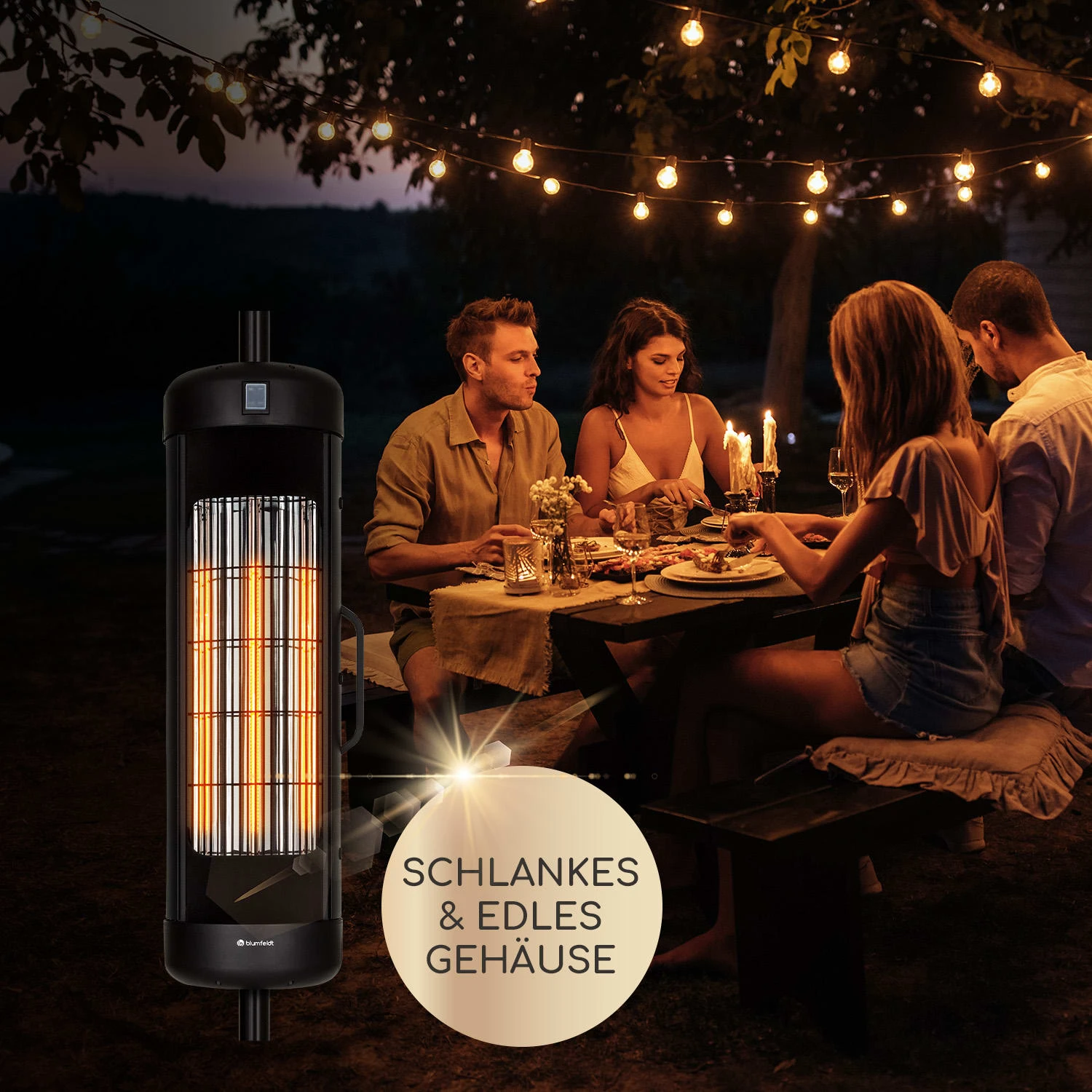 Für besonders effektive Wärmestrahlung sorgt das Carbon-Gold-Heizelement mit einer Leistung von 2000 Watt. Das IR ComfortHeat-System liefert dabei nicht nur sehr schnell Wärme, sondern gibt sie dank hocheffizientem Reflektor und langwelliger Infrarot-Strahlung gezielt an in der Nähe befindliche Personen und Gegenstände ab, ohne die Luft aufzuheizen. Genieße wohlige Wärme ab der ersten Sekunde und passe sie mit den 3 Leistungsstufen an deine Bedürfnisse an! Den Anforderungen der Schutzklasse IP54 entsprechend ist das eloxierte Aluminiumgehäuse des blumfeldt Heat Guru Turbo Infrarotheizgeräts vor Spritz- und Strahlwasser geschützt und bestens für den Einsatz im Freien geeignet. Besonders praktisch: Der Heat Guru Turbo wird ganz einfach am Sonnenschirmständer installiert. So benötigt er keinen eigenen Standfuß und ist überall einsetzbar, wo du tagsüber sowieso einen Sonnenschirm stehen hast.