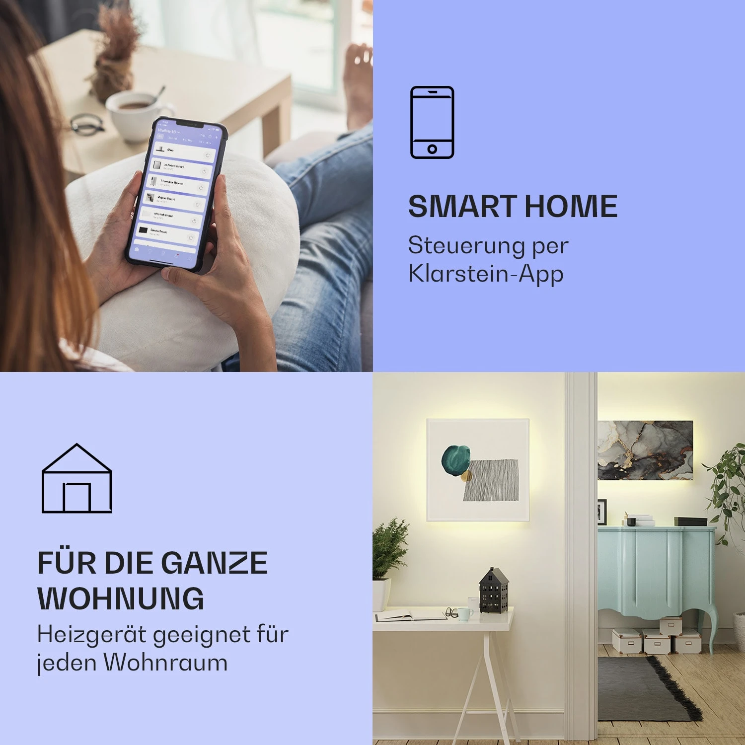 Doppelte Leistung bei gleicher Größe, die Klarstein Mojave 2-in-1 Heizgeräte vereinen geschickt einen Infrarotheizstrahler mit einem Konvektor und schaffen so in platzsparender Bauweise nicht nur schnell fühlbare Infrarot-Wärme, sondern erzeugen auch kuschlig warme Raumluft über rückseitig aufsteigende Wärme. Dabei hast du, passend zur Größe deines Raums, die Wahl zwischen einem 500, 750 oder 1000 Watt starken Heizgerät. Das gradweise einstellbare Thermostat und der Wochentimer werden dabei ganz smart via Klarstein-App oder per Fernbedienung gesteuert. Dank IP44 Sicherung sind die Konvektoren auch bestens fürs Bad geeignet. Ganz egal wo du dein neues Klarstein Mojave Smart Heizpanel aufhängst, mit seinem farbigen RGB-Ambientelicht erzeugt es überall die passende Atmosphäre.
